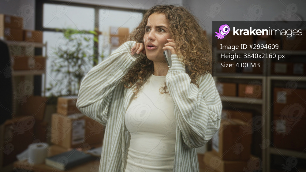Woman holds phone to ear, fingers at ear beside stacked boxes and shelves in building; frustration concern.