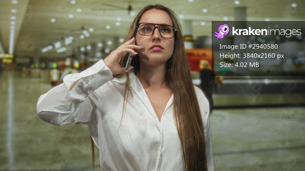 Woman holds phone to ear in an airport terminal while looking upward, wearing glasses and white blouse, long hair visible; anxious.