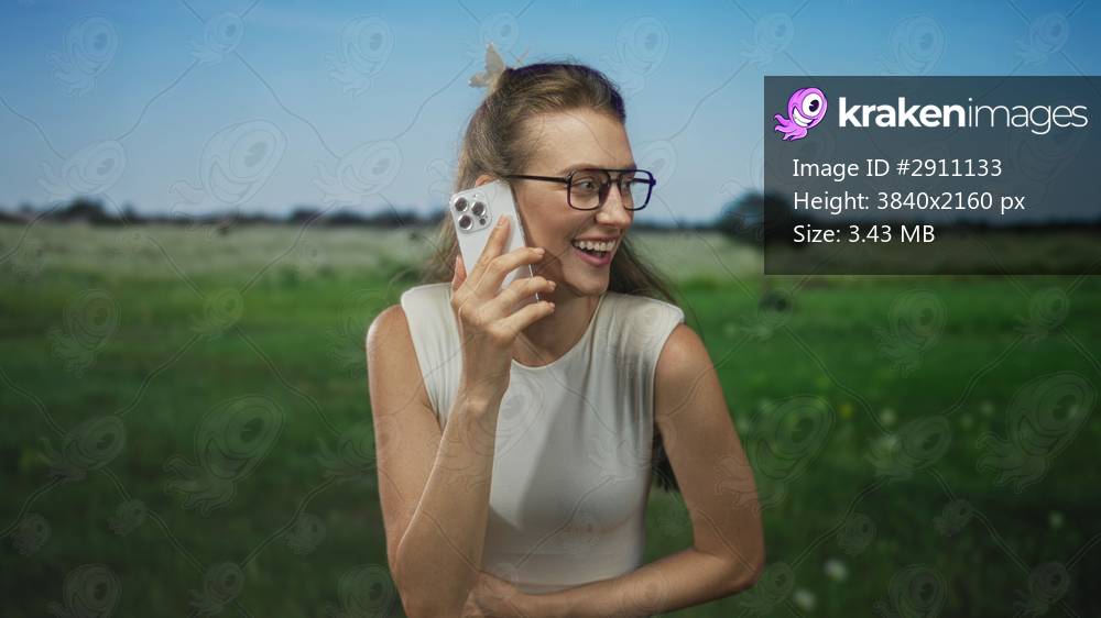 Woman holds phone to ear and laughs while wearing glasses and a white sleeveless top in a green countryside field under blue sky; warm joy connection.