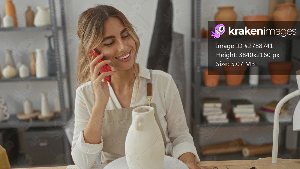 Woman holds phone to ear near spinning clay wheel with unfinished vase in pottery studio; communication creativity.