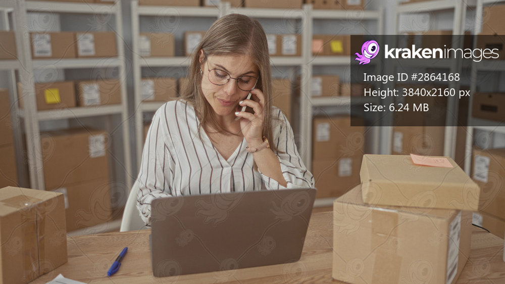 Woman holds phone to ear next to laptop and parcel box on table in building; productivity efficiency concentration.