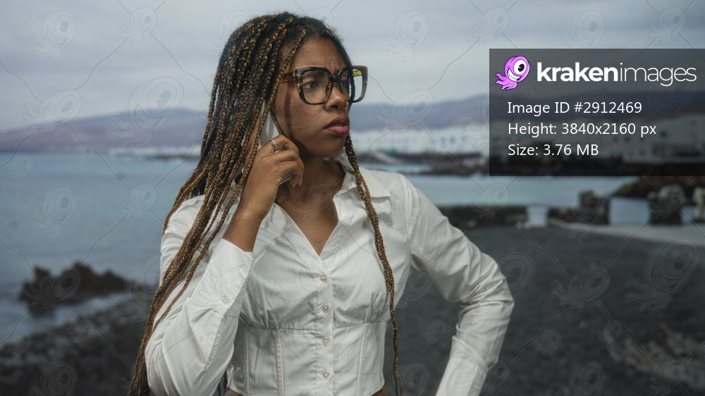 Woman holds phone to ear on beach with sunglasses, long braids and white shirt, looking sideways toward seaside buildings; quiet confidence.