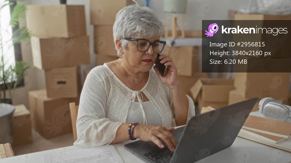 Woman holds phone to ear and types on laptop with hand amid packed moving boxes in building; focused organizing and planning.