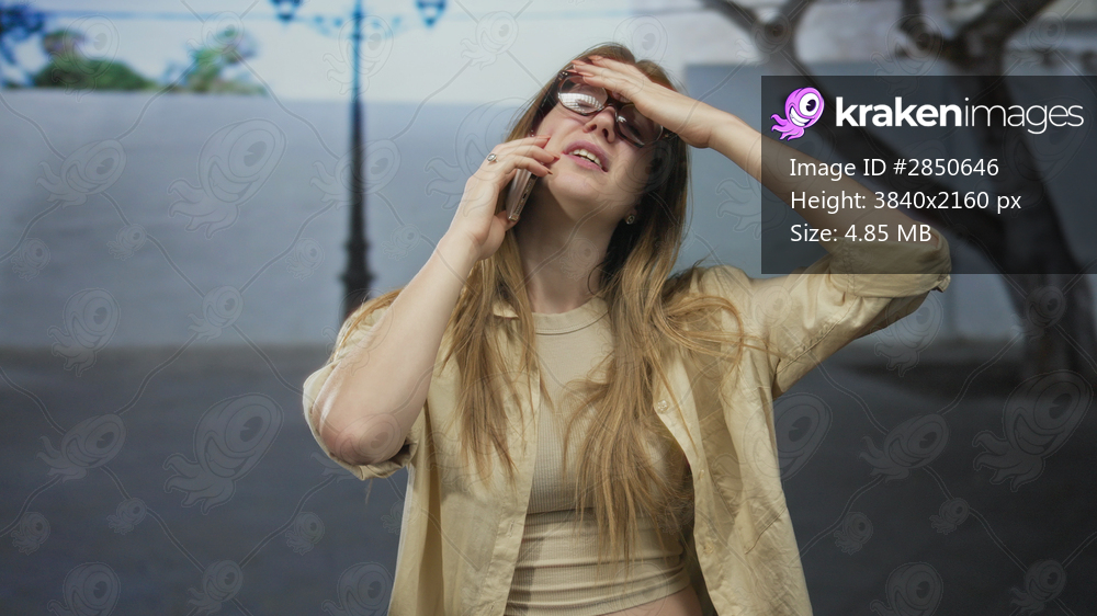 Woman holds phone to ear while shading eyes from bright sunlight on street lined with lamppost; frustration.
