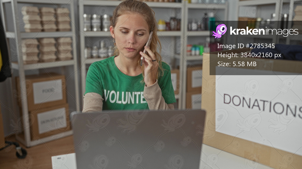 Woman holds phone while calling from a warehouse office, typing on laptop as volunteer organizes donations on a shelf beside a box and checks inventory. - Kraken Images
