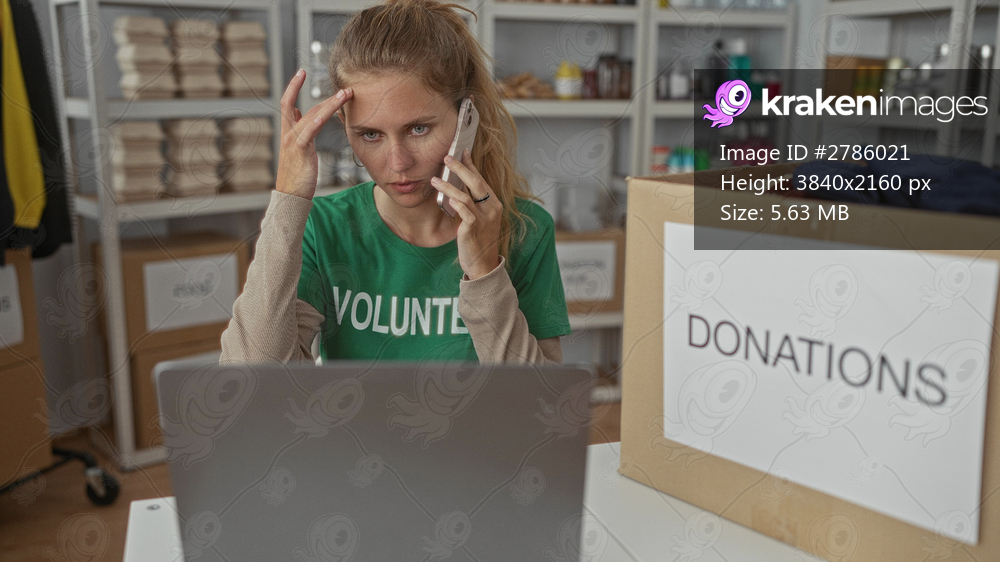 Woman holds phone while calling from a warehouse office, typing on laptop as volunteer organizes donations on a shelf beside a box and checks inventory. - Kraken Images