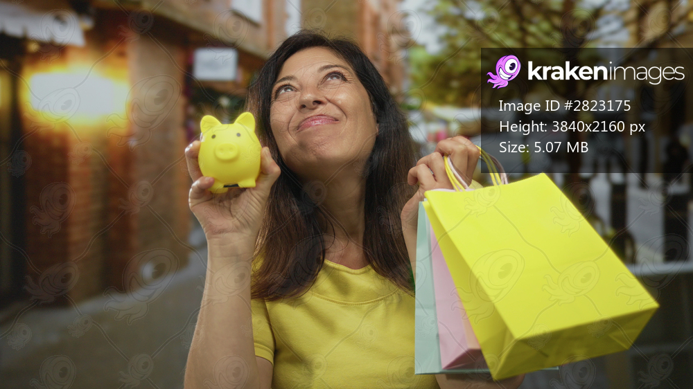 Woman holds piggy bank and shopping bags on city street while smiling broadly under sunlight; savings happiness.