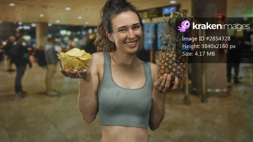 Woman holds pineapple and bowl of chips at airport terminal while smiling broadly under fluorescent lights; joy.