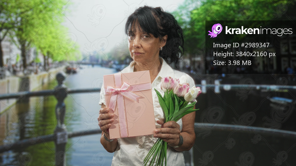 Woman holds pink gift box and bouquet of tulips with hands, looking at gift on canal bridge; nostalgia memory.