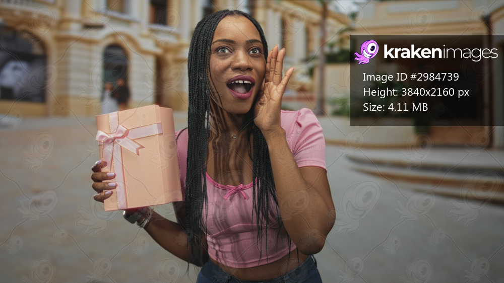 Woman holds pink gift box and waves hand near building entrance, smiling with braided hair and cropped pink top; celebration joy.