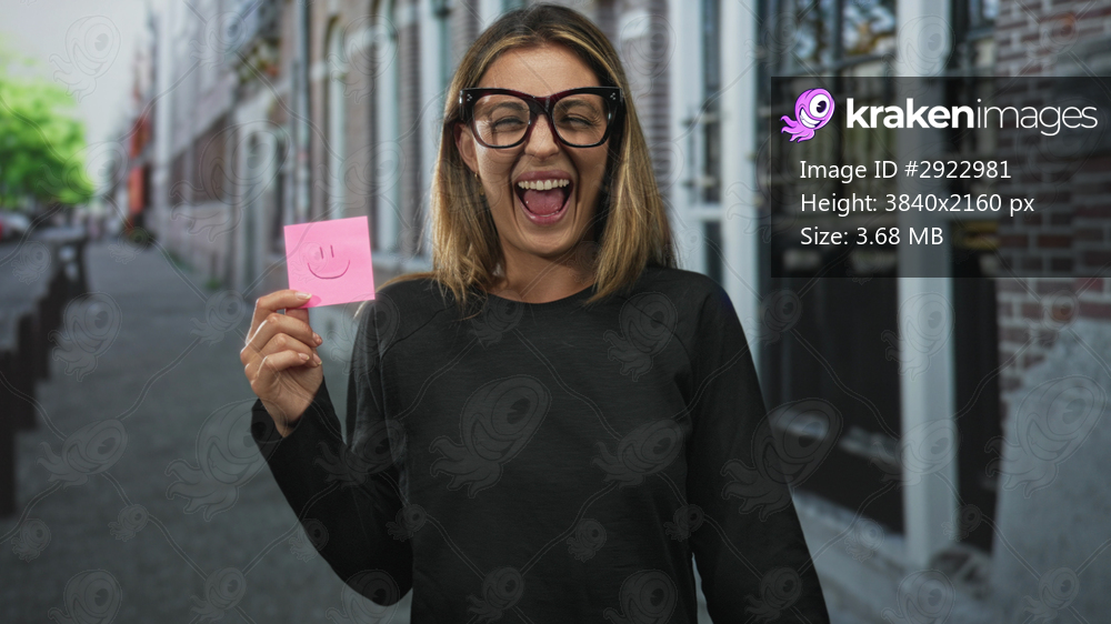 Woman holds pink sticky note with drawn smile, smiling with hand visible on a city street by brick building and storefront; joy positivity.