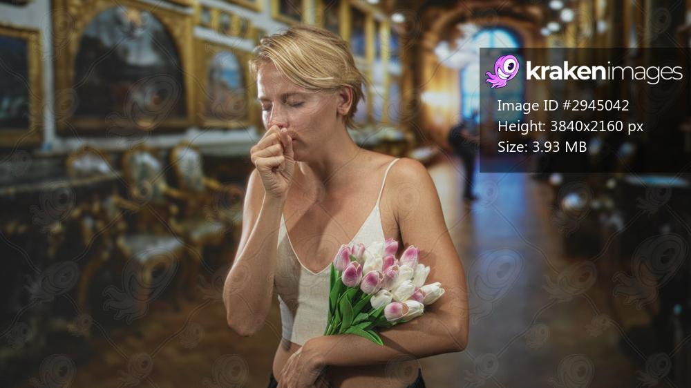 Woman holds pink tulips and coughs into her fist in an ornate building filled with paintings and chairs; vulnerability fatigue.