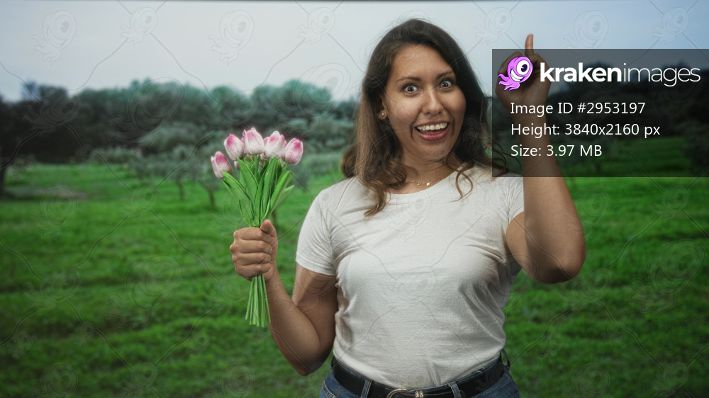 Woman holds pink tulips with finger to chin in a green field wearing white tshirt and jeans; thoughtful.