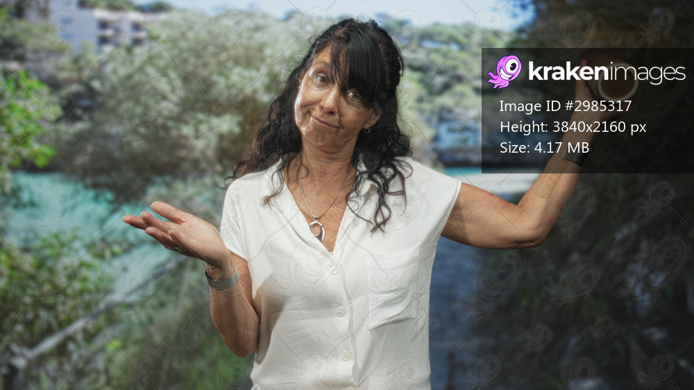 Woman holds pottery bottle in one hand and gestures a casual shrug with palm exposed near a building, rings and bracelet visible; bemused.