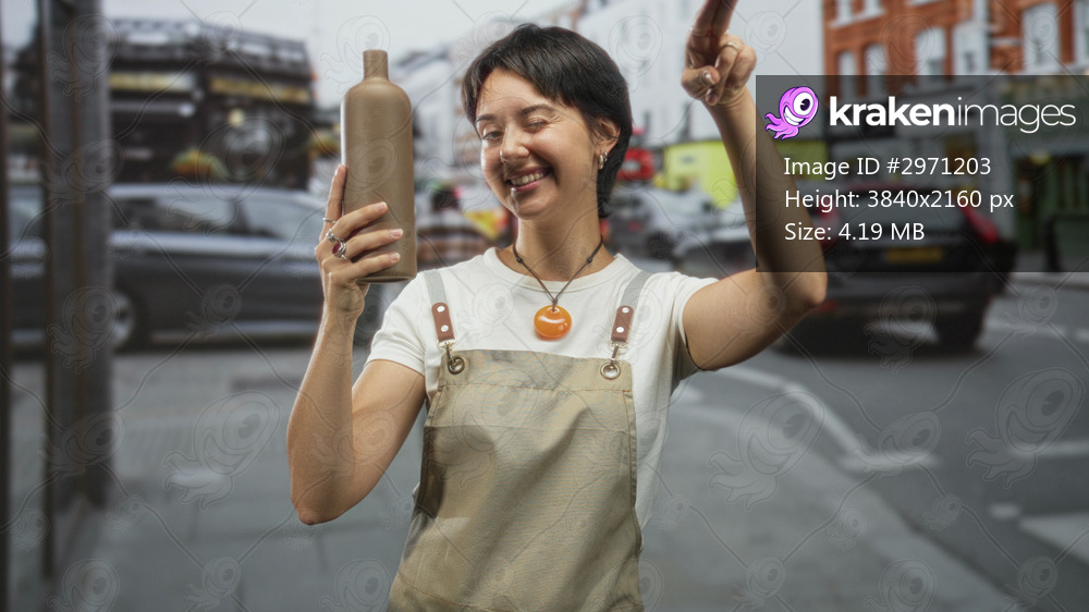 Woman holds pottery bottle and winks while flashing a peace sign on a busy city street, wearing an apron and pendant; playful craft.