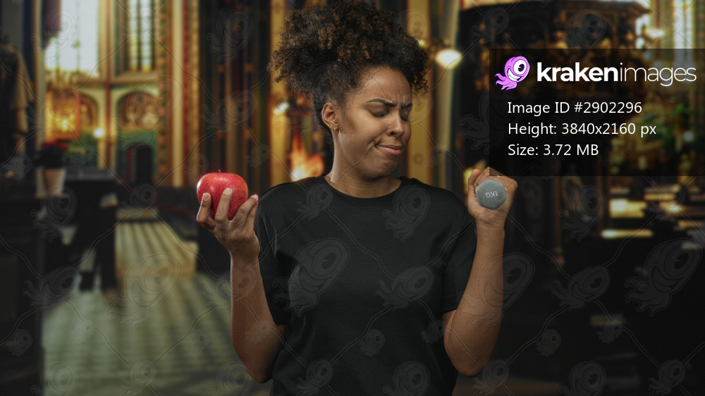 Woman holds red apple and 1kg dumbbell in her hands inside a church building, grimacing; temptation and doubt.