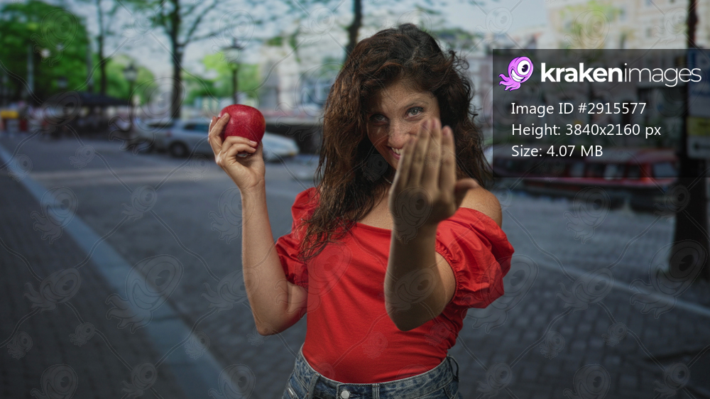 Woman holds red apple and beckons with outstretched hand on city street while smiling in red top; playful invitation.