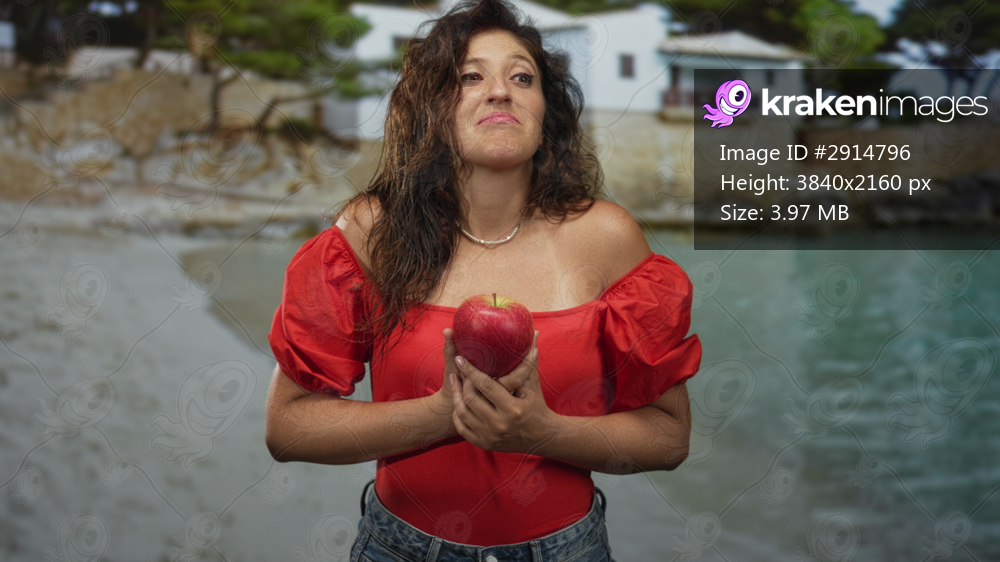 Woman holds red apple with both hands, bare shoulders visible, standing on sandy beach by seaside building; temptation playful.
