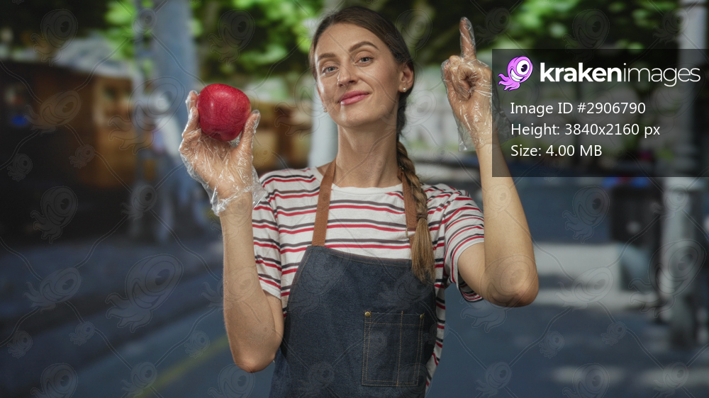 Woman holds red apple with gloved hand and points finger up on street market wearing denim apron and striped shirt; friendly local produce.