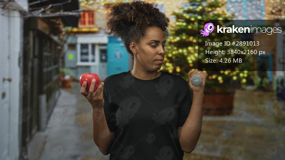 Woman holds red apple in left hand and dumbbell in right on wet street with lit tree behind; health choice contemplation.