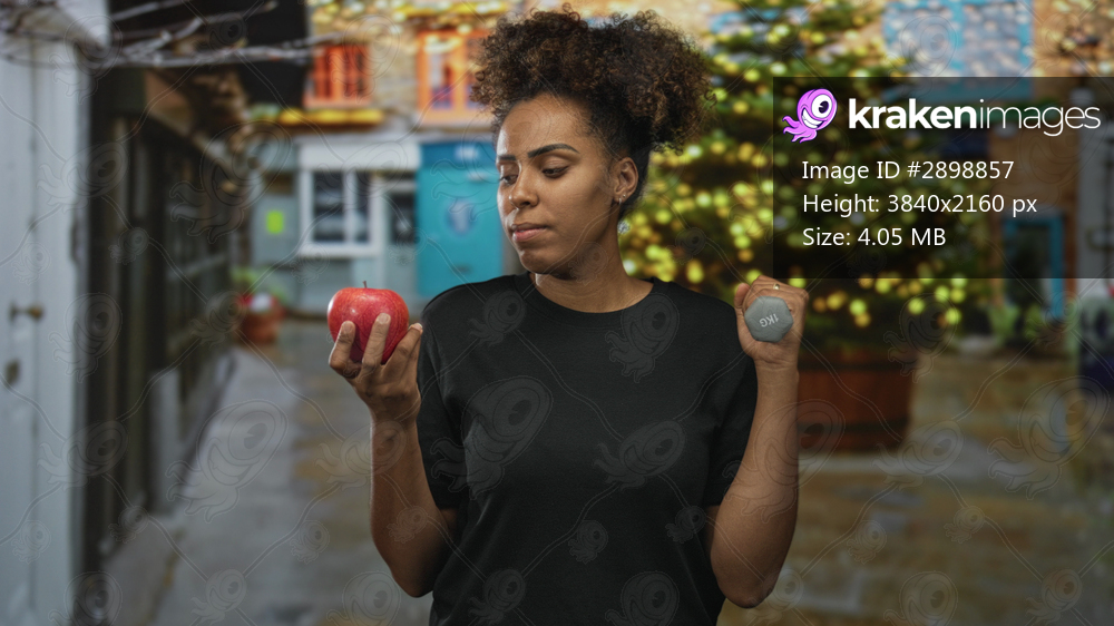 Woman holds red apple in left hand and dumbbell in right on wet street with lit tree behind; health choice contemplation.