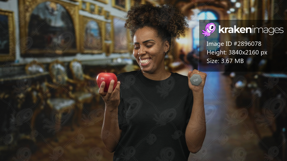Woman holds red apple and lifts 1kg dumbbell in a museum gallery, smiling; healthy choices happiness.