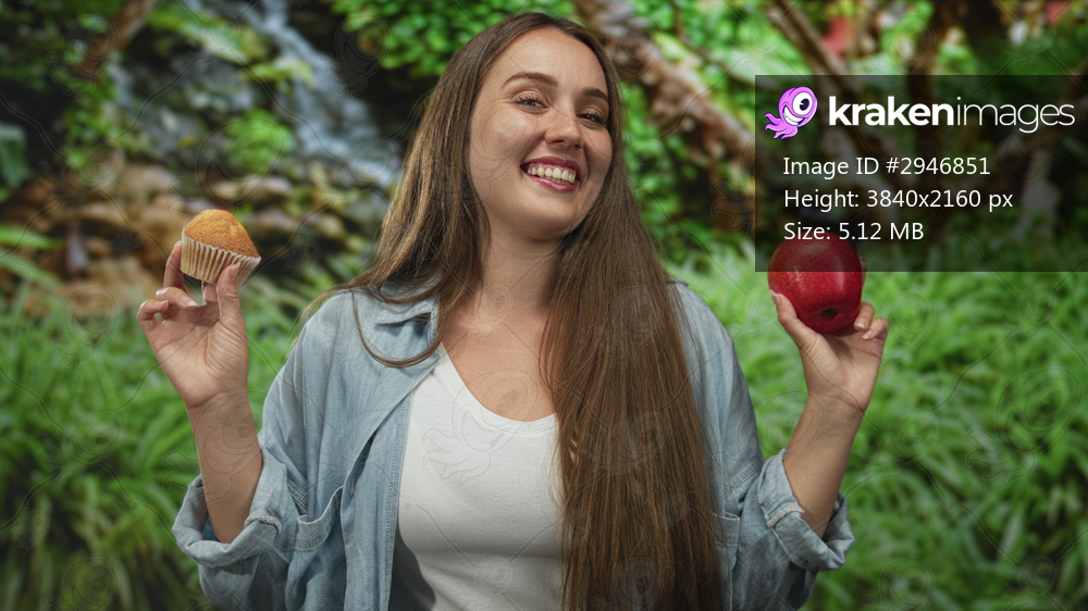 Woman holds red apple and muffin in forest among lush green plants while smiling and comparing snacks; healthy choice joy.