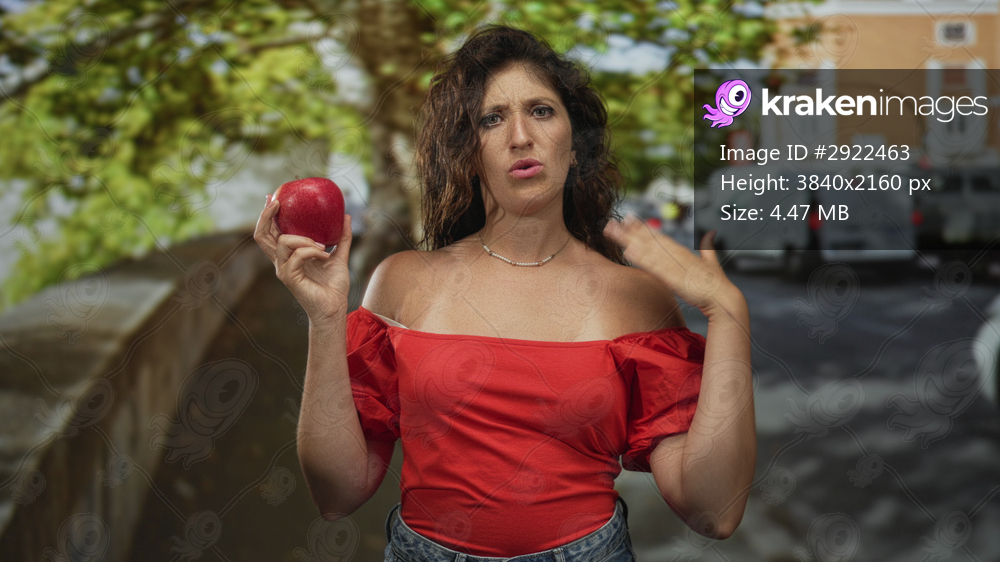 Woman holds red apple and raises right hand in a shrug on street with parked cars and trees; uncertainty choice.