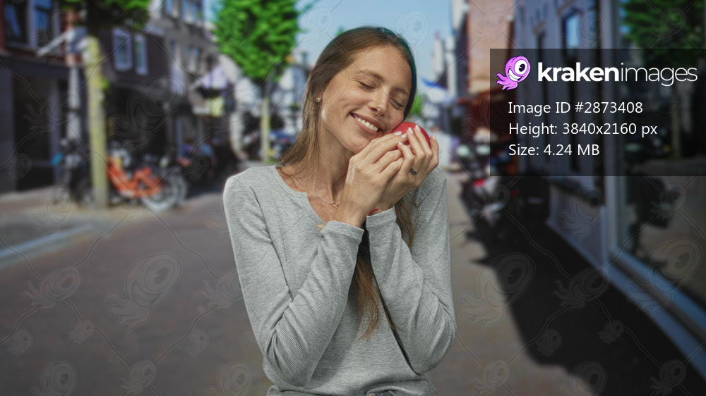 Woman holds red apple to cheek on city street smiling with eyes closed wearing gray long sleeve top; contentment wellness.