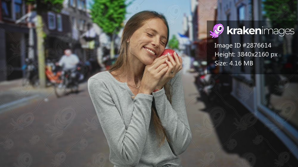 Woman holds red apple to cheek on city street smiling with eyes closed wearing gray long sleeve top; contentment wellness.