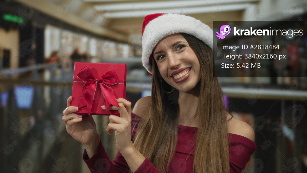 Woman holds red gift box with hands in a shopping mall building; holiday joy.