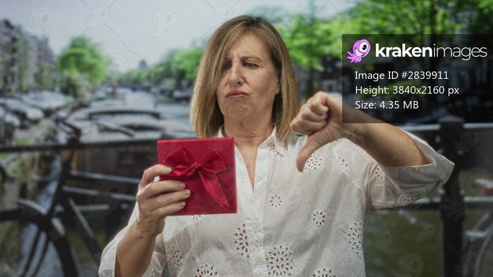 Woman holds red gift box in one hand and makes thumbdown gesture with other on street by canal; disappointment.