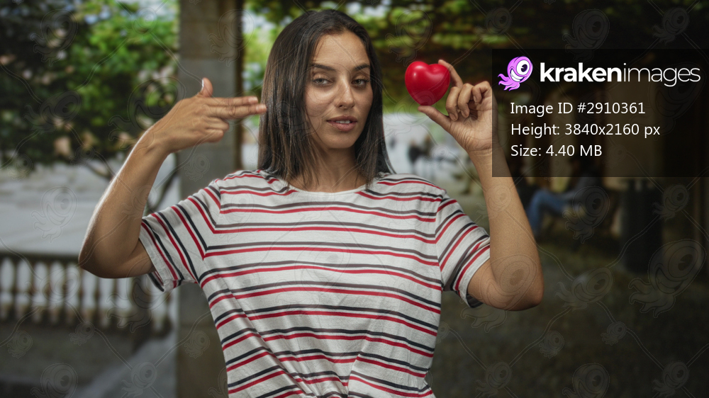 Woman holds red heart between fingers on street columned walkway, raises two fingers in dismissive gesture; romantic doubt.