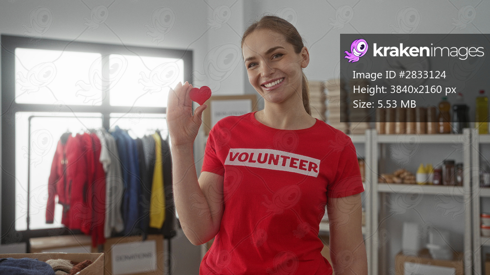 Woman holds red heart prop in donation center building with her right hand while smiling warmly; compassion.