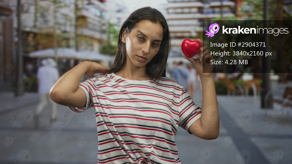 Woman holds red heart up with right hand on city street plaza wearing striped shirt and neutral face; quiet contemplation.