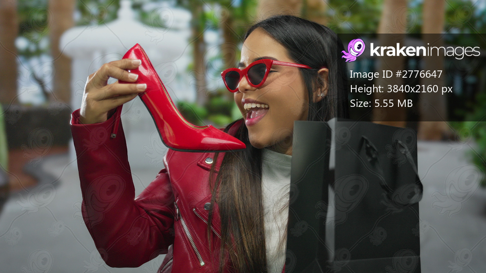 Woman holds red high heel and black shopping bag outdoors, showcasing a joyful shopping experience in a lively urban street environment.