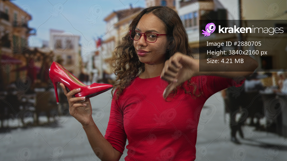 Woman holds red high heel shoe and gives thumbs down in a street cafe scene with blurred outdoor diners; shopping disapproval.