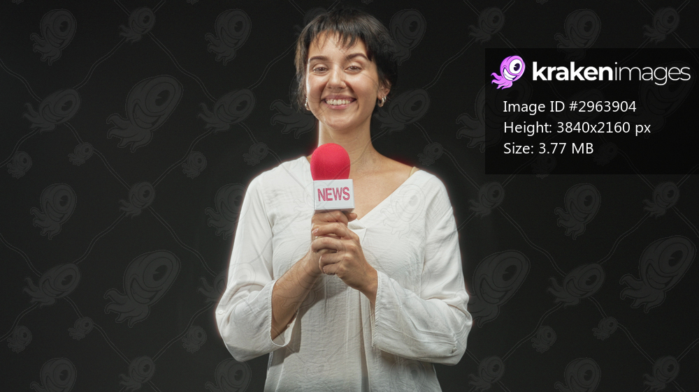 Woman holds red microphone labeled news with both hands while smiling in studio; live broadcast confidence.