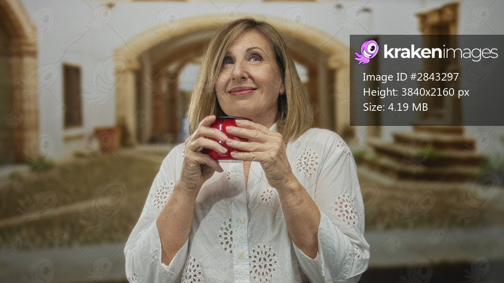 Woman holds red mug with bare hands on sunny old town street, smiling warmly and looking upward; serenity.