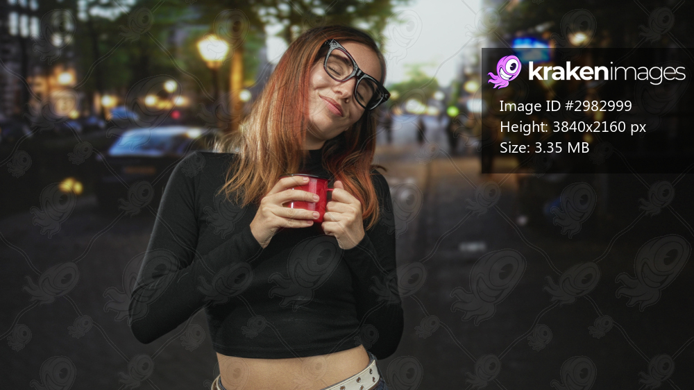 Woman holds red mug with both hands, head tilt and gentle smile, wearing glasses and black crop top on an urban street at dusk; cozy contentment.