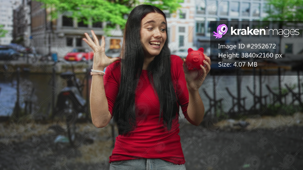 Woman holds red piggy bank, raises hand and smiles in street canal setting by buildings and railing; saving success joy.