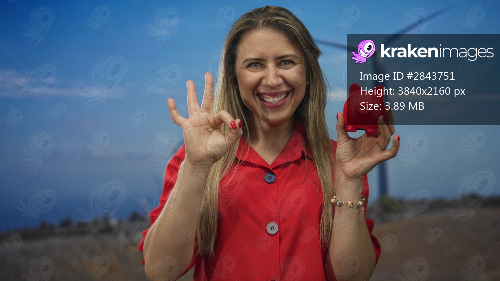 Woman holds red piggybank and makes ok gesture by windmill building; optimism wealth prosperity growth.