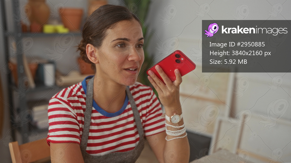 Woman holds red smartphone near mouth while speaking in artisan studio at pottery table wearing apron surrounded by canvases and clay pots; focused creativity. - Kraken Images
