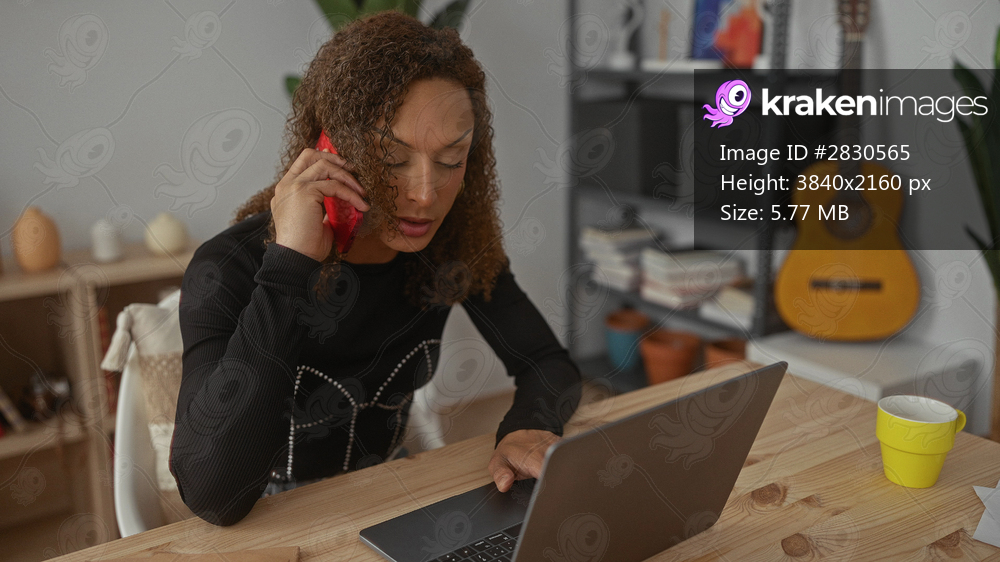 Woman holds red smartphone to ear inside building; professional productivity concentration efficiency.