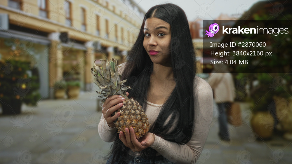 Woman holds ripe pineapple with both hands on a city street lined with shops with a playful smile; tropical freshness vibrancy curiosity.