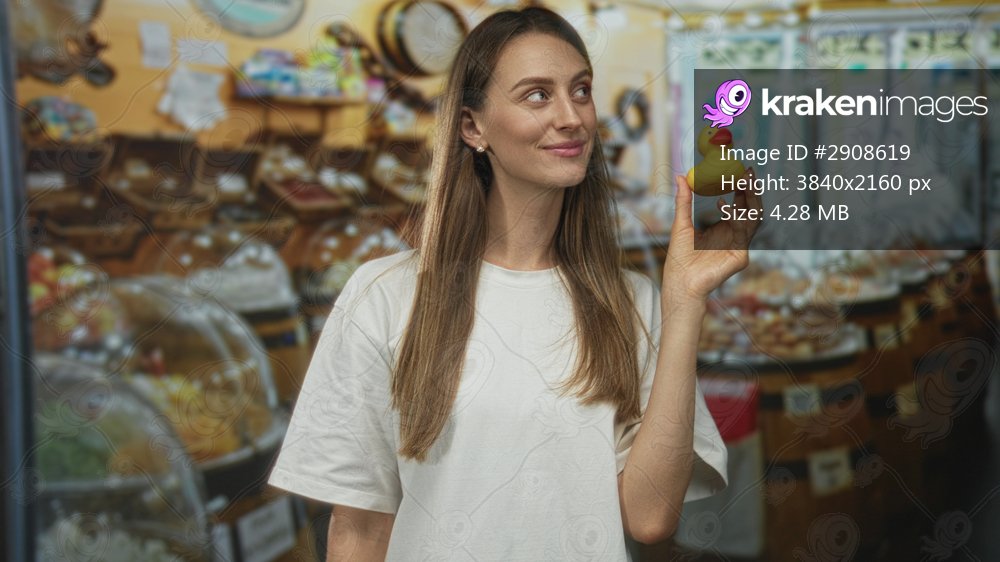 Woman holds rubber duck up by hand in a candy store building smiling while looking aside; playful curiosity.