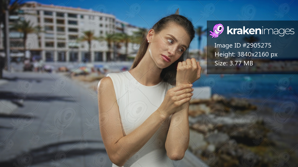 Woman holds and rubs her wrist with the other hand on a crowded street promenade by the seaside, grimacing in a white sleeveless top; pain recovery.