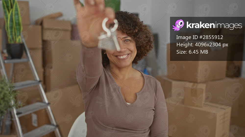 Woman holds silver house key ring in hand inside building foyer amid cardboard boxes; fresh start joy.