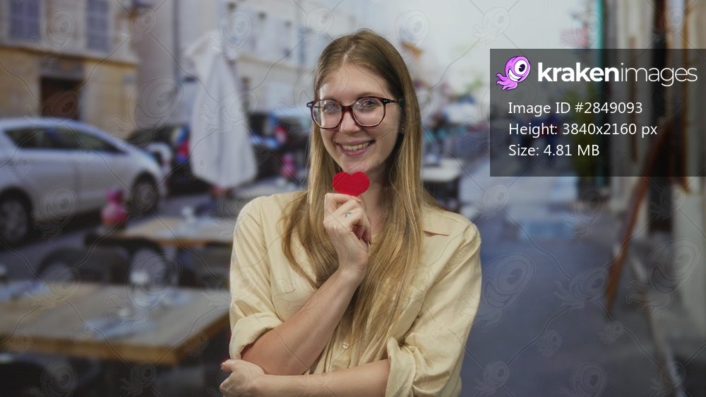 Woman holds small red heart near street table with parked cars and passing people at restaurant terrace; affection romance.