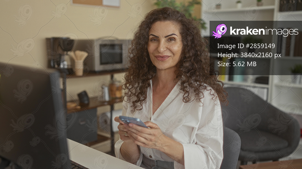 Woman holds smartphone with both hands and looks at screen at desk in office building; concentration productivity.